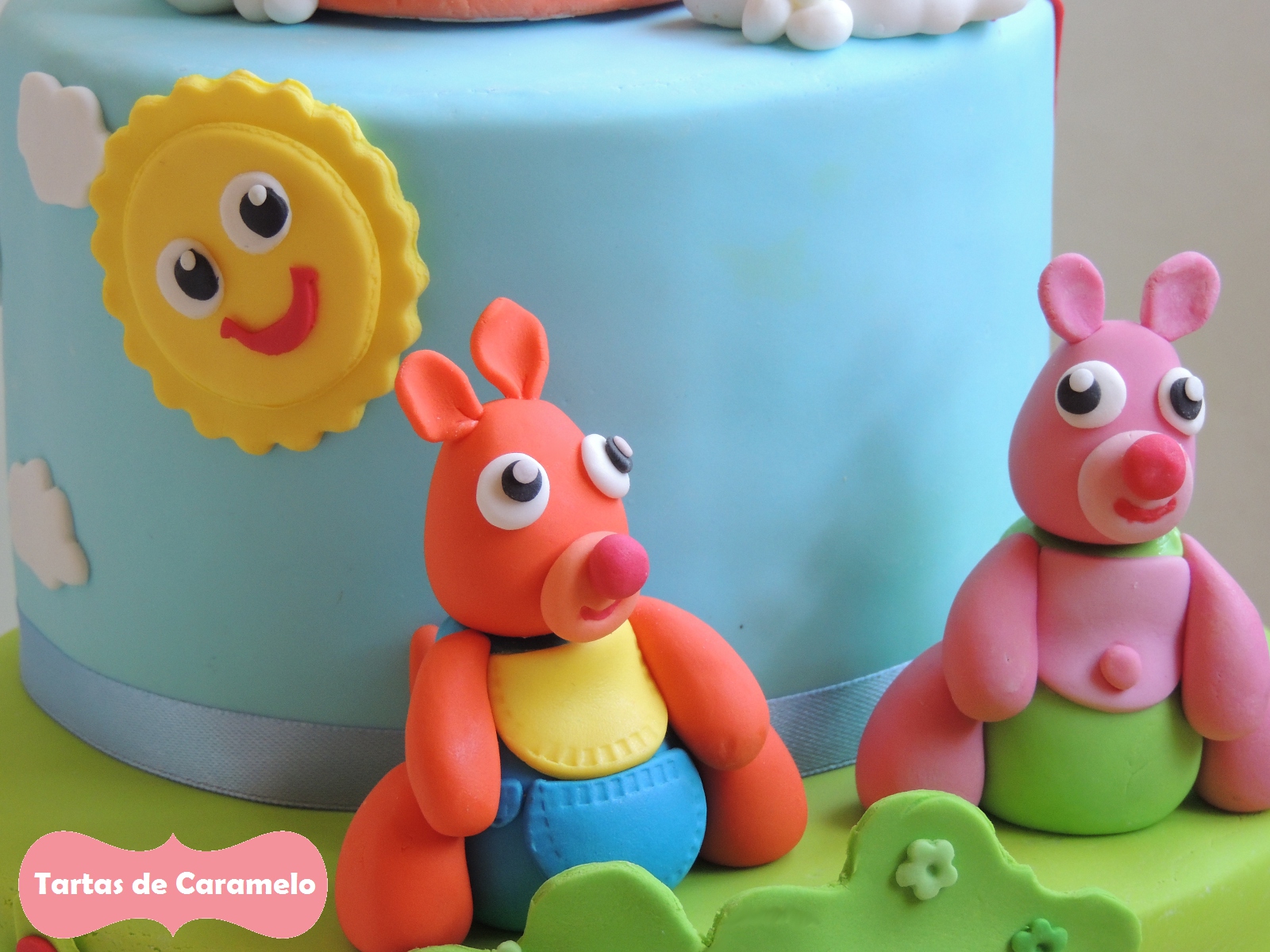 Así que no había más remedio que inventarme todo de cero. .. me ví decenas de dibujos animados de Kenny & Goorie, de Popiz y de Billy Bam Bam hasta que me decidí por Kenny & Goorie. Me parecía que Kenny & Goorie eran más sencillos de modelar en fondant y, además, vivían en un bosque con una casa en un árbol, lo cual me resultó muy útil para el paisaje de la tarta el bosque donde viven.... y, casualidad o no, en algunos de sus dibujos salían un globo, lo cual me venía al pelo para la tarta.